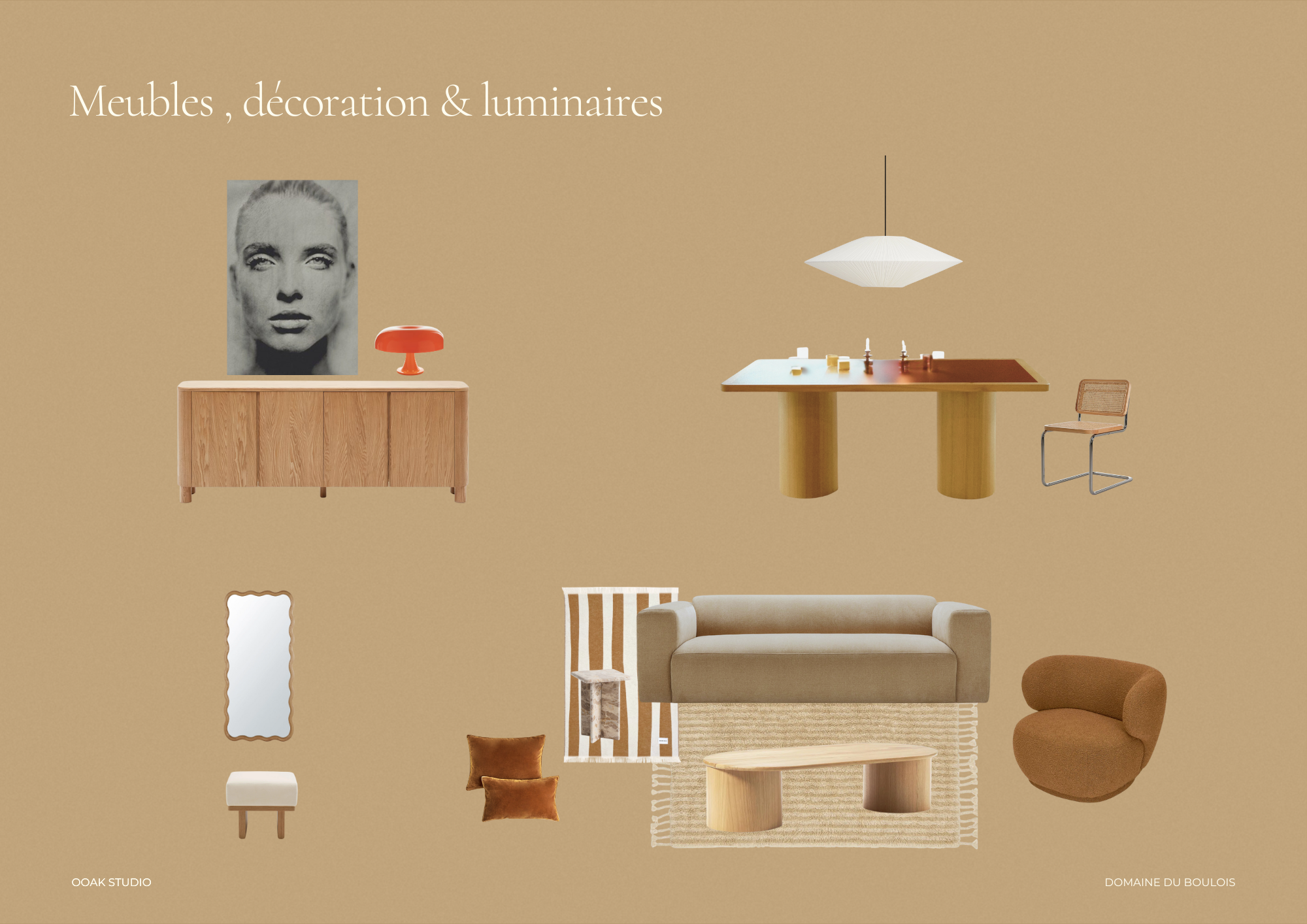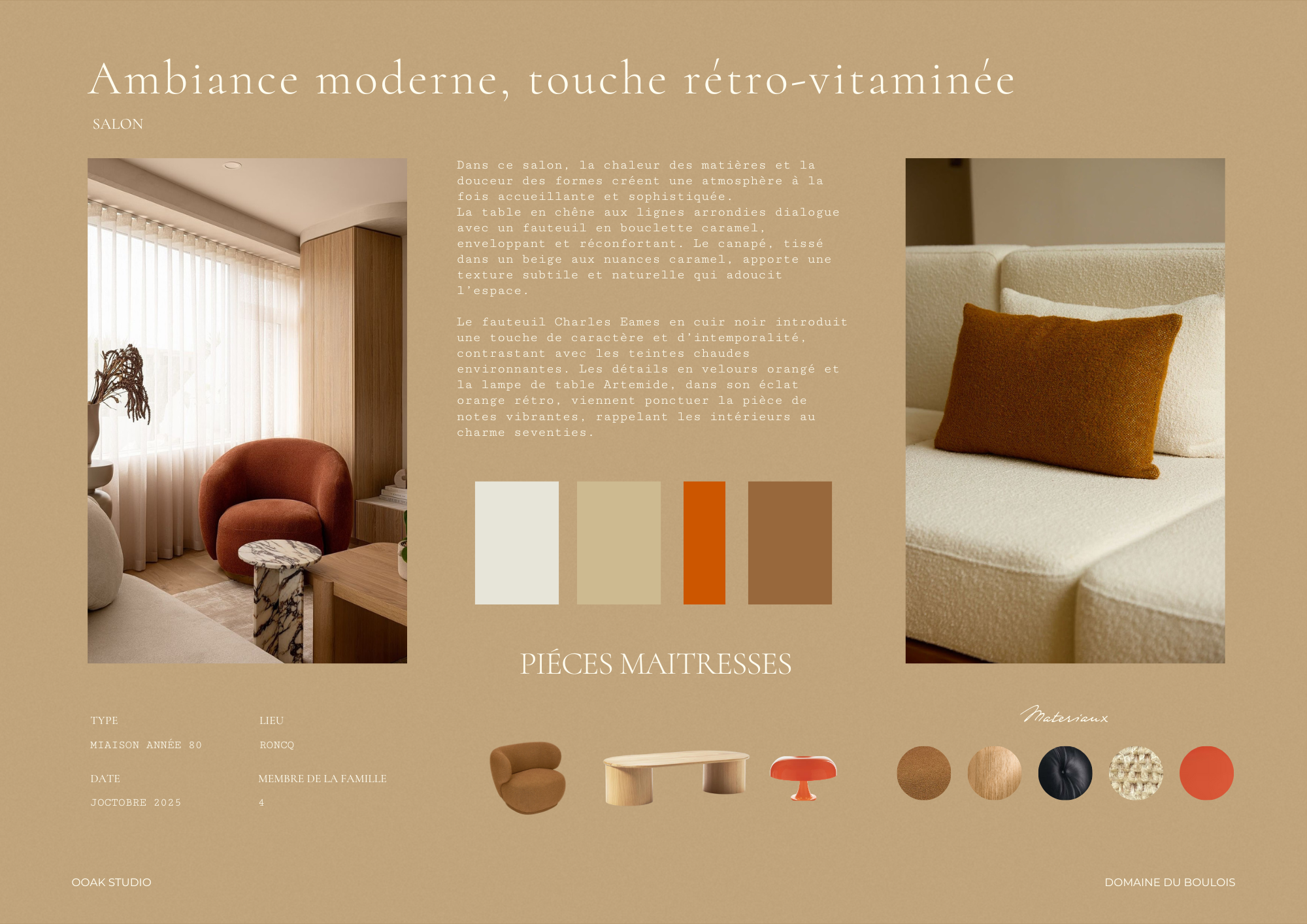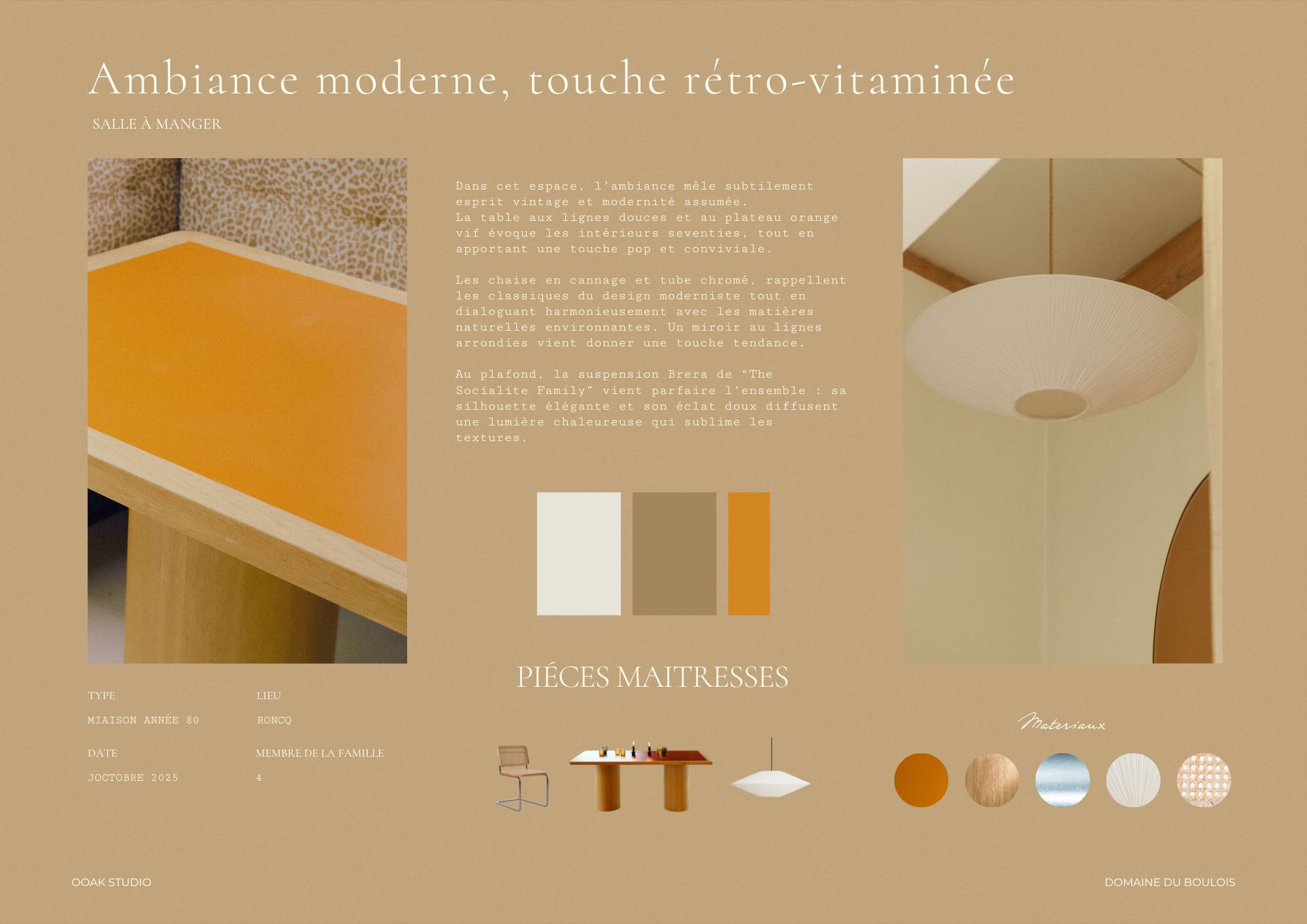 Ce PROJET explore un univers épuré et chaleureux, où la douceur des matières naturelles et des teintes orangées se mêle à des contrastes AUDACIEUX inspirés des années 70.